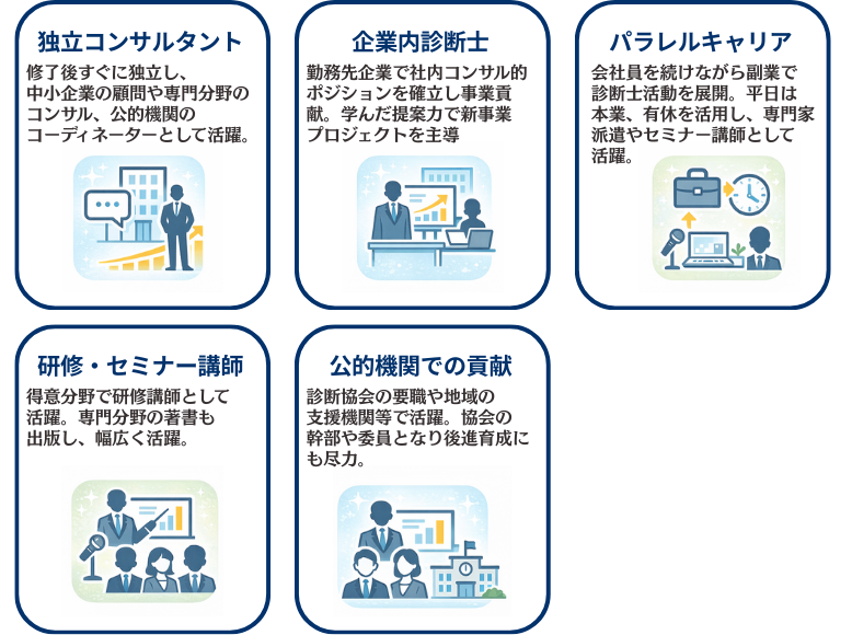 独立・企業内・パラレルキャリアなど、さまざまな立場で活躍する中小企業診断士を輩出しています。