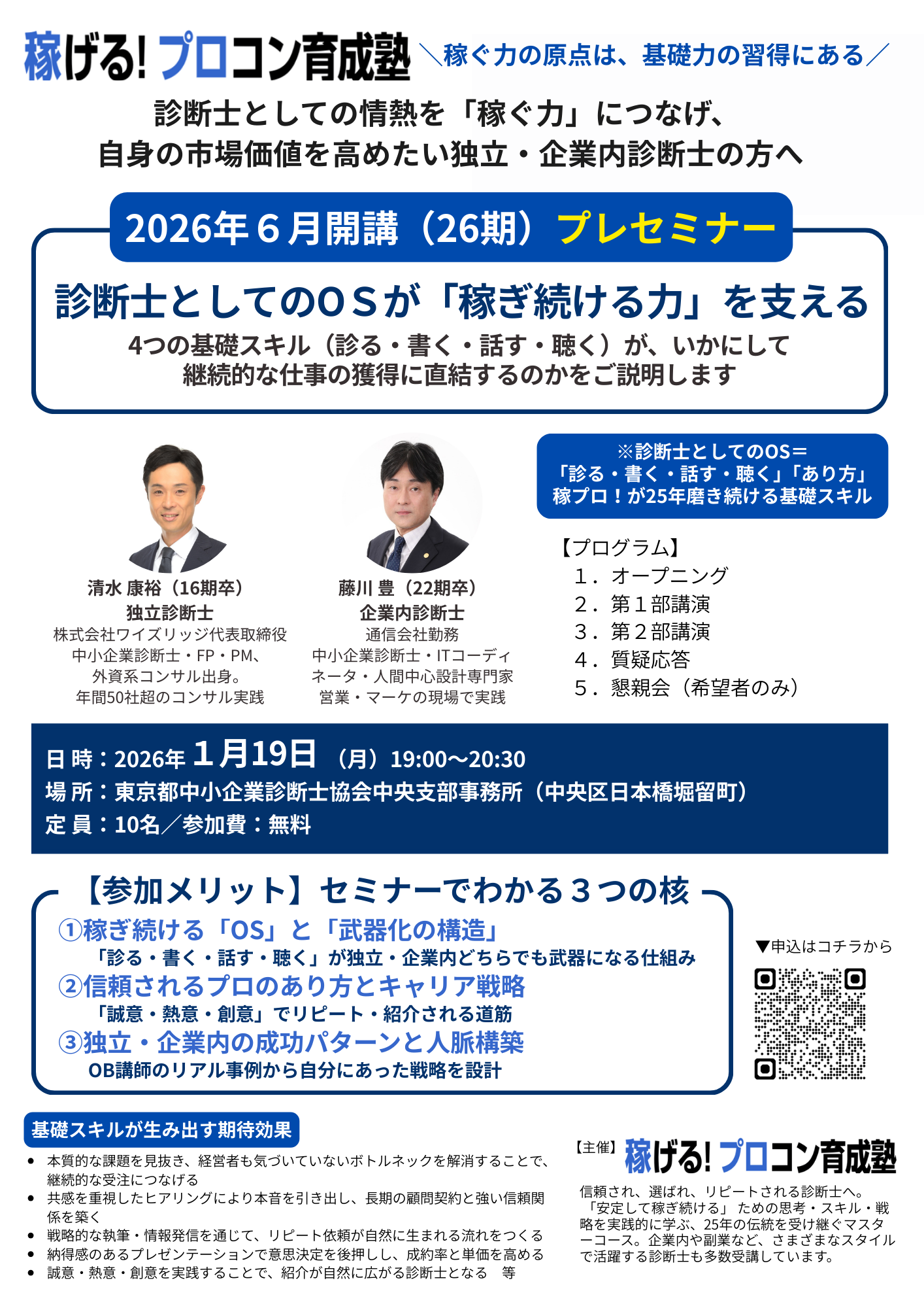 診断士としての「OS(基礎力)」が、なぜ稼ぎ続ける力につながるのかを整理するプレセミナーです。
