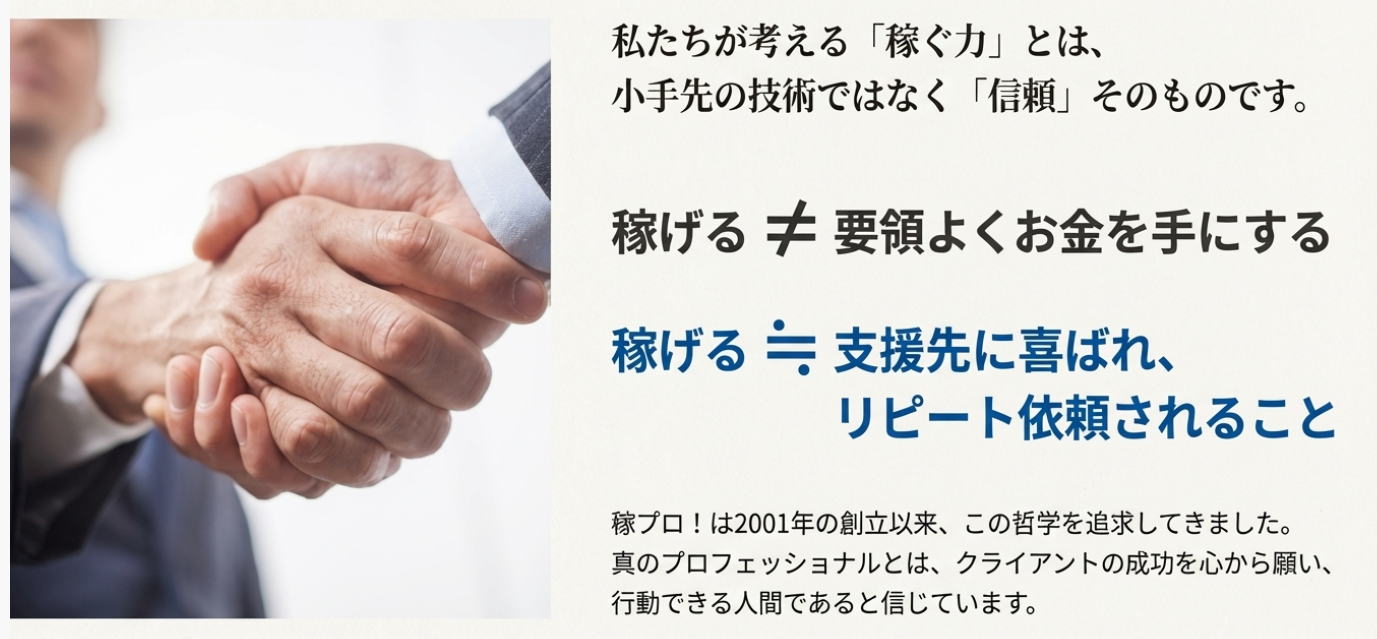 本セミナーでは、稼プロ!が長年磨き続けてきた基礎力を軸に、 それらがどのように評価・信頼・収益へとつながっていくのかを、 清水康裕さん(16期卒)、藤川豊(22期・事務局)の2人の卒塾生から実際の事例を交えながら解説します。