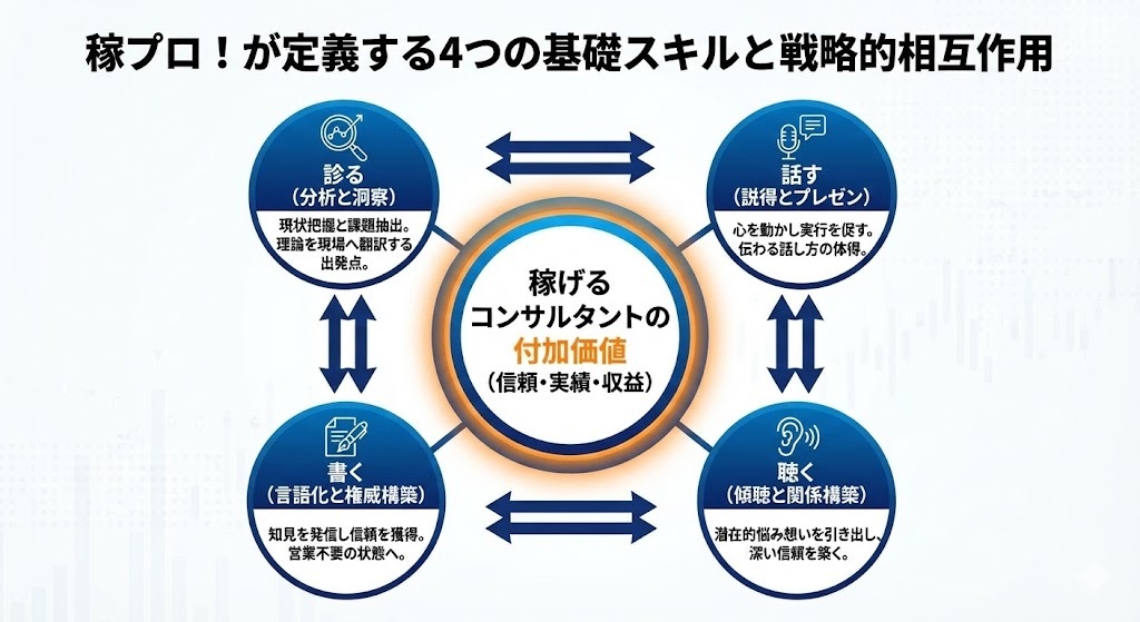稼プロ!のカリキュラムは、独立・企業内を問わず、 診断士として評価され続けるための「実務に直結する4つの基礎スキル」を軸に設計されています。